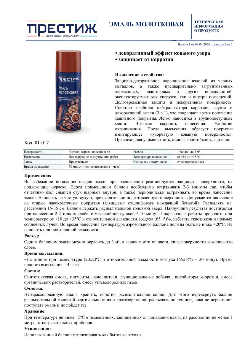 Добавить поверхностьПеред применением баллон необходимо встряхнуть 2-3 минуты так, чтобы отчетливо был слышен стук шариков внутри, а также периодически встряхивать баллон во время нанесения. Эмаль наносить на чистую, сухую, предварительно подготовленную поверхность. Допускается нанесение на старые лакокрасочные покрытия (глянцевые необходимо заматировать наждачной бумагой). Распылять на расстоянии 15-35 см. Наилучший результат достигается при нанесении 2-3 тонких слоев, с межслойной сушкой 5-10 минут.