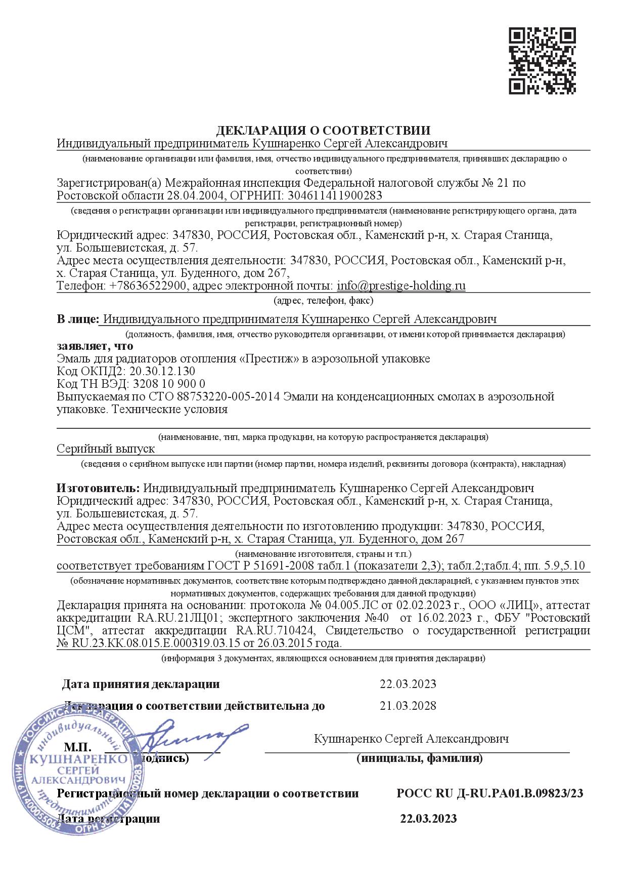 Аэрозольная эмаль ПРЕСТИЖ для радиаторов белая глянцевая 425мл