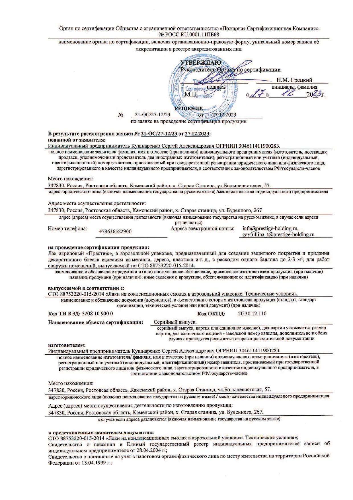 Аэрозольный лак акриловый ПРЕСТИЖ матовый 425мл