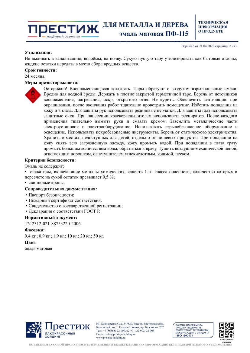 Эмаль ПРЕСТИЖ ПФ-115 белая матовая ГОСТ 1,9кг