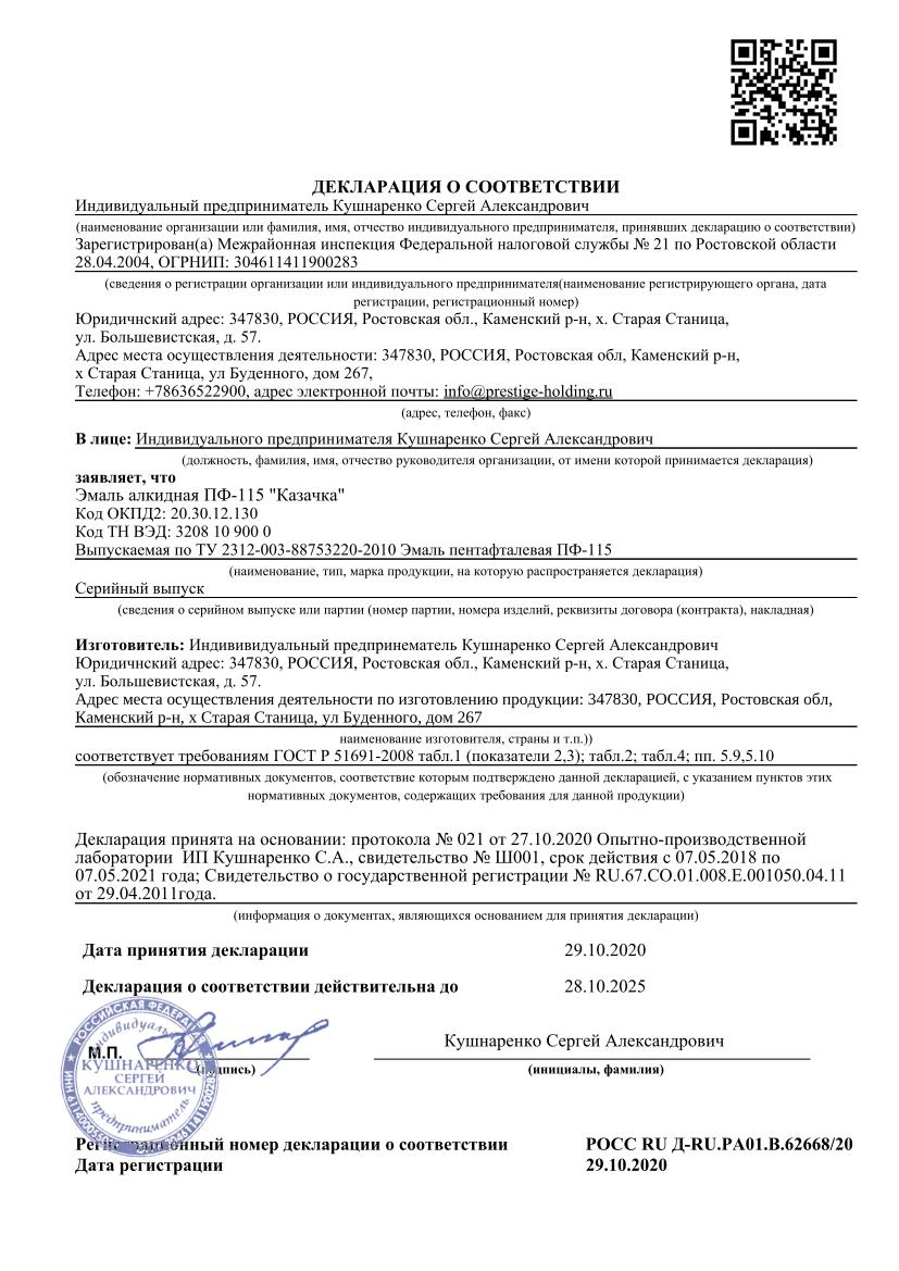Эмаль КАЗАЧКА ПФ-115 слоновая кость глянцевая 0,9кг