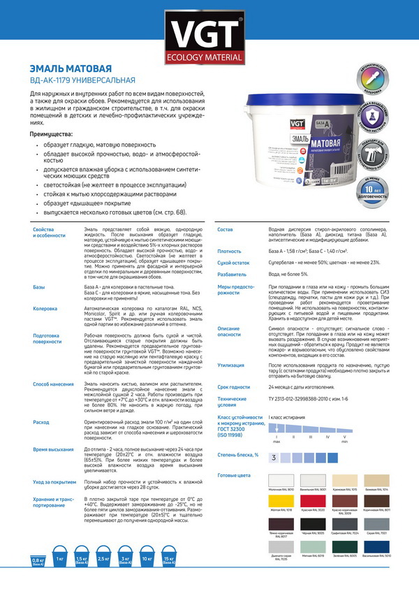 Эмаль ВГТ акриловая ВД-АК-1179 матовая ванильная RAL9001 1кг