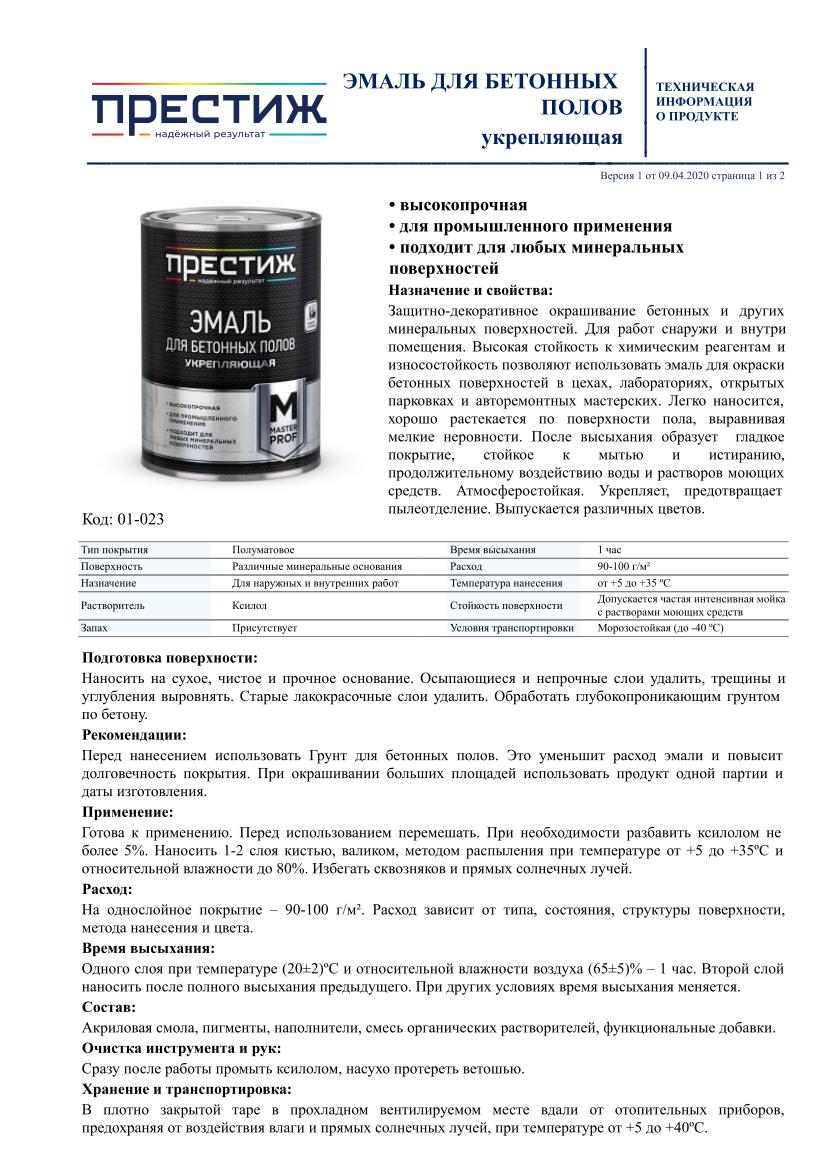 Эмаль ПРЕСТИЖ для бетонных полов укрепляющая серая 4кг