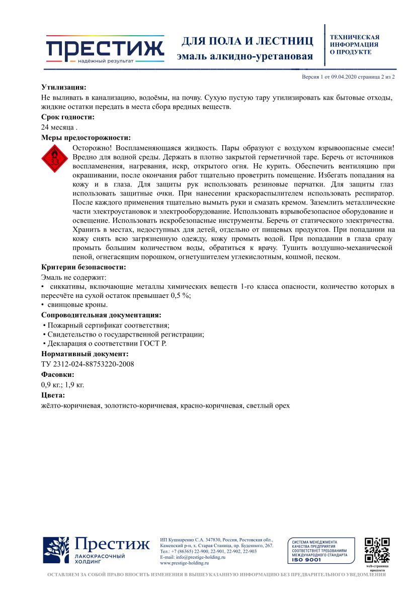 Эмаль ПРЕСТИЖ алкидно-уретановая для пола и лестниц быстросохнущая светлый орех 0,9кг