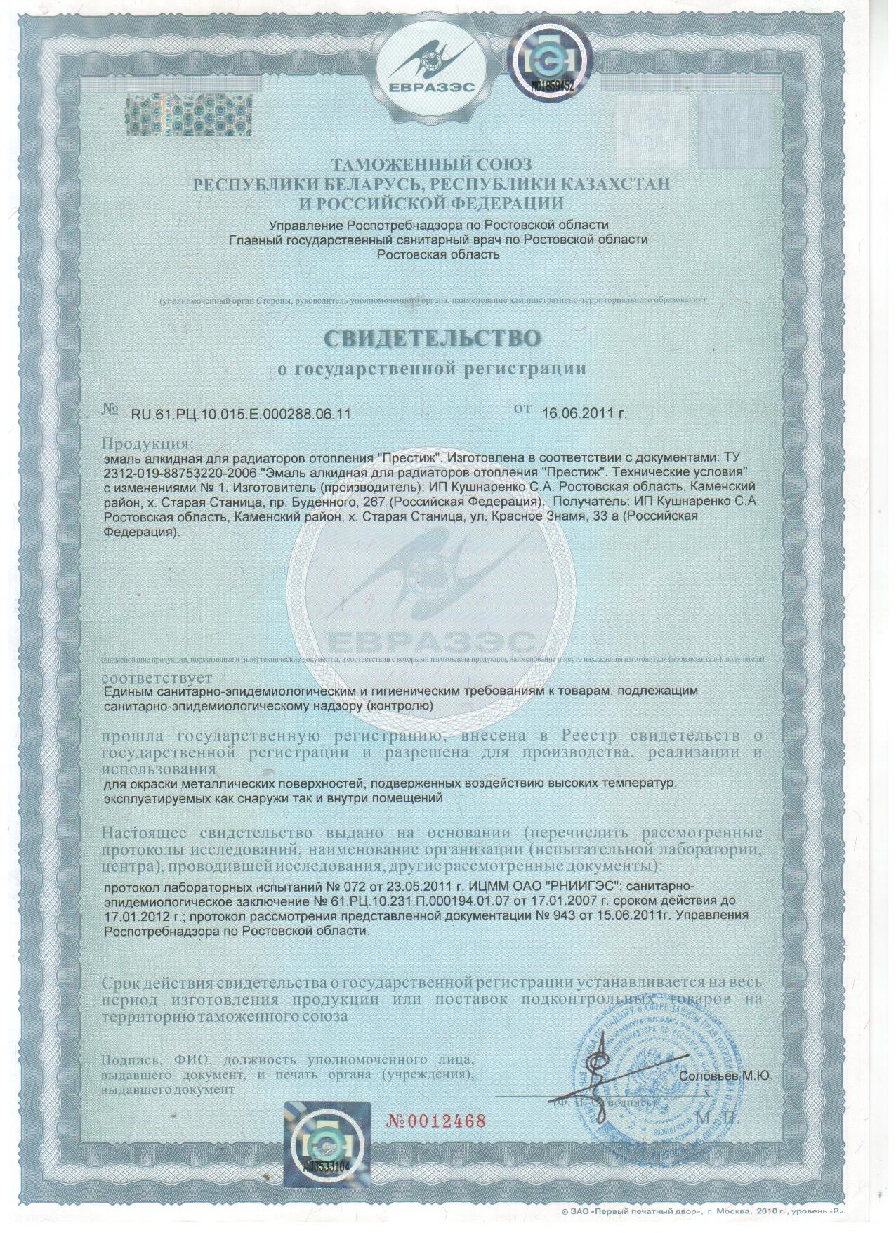 Высыхание: 12ч. Поверхность готова к эксплуатации через 24 часа после нанесения последнего слоя. Температура окрашиваемой поверхности не должна превышать +40ºС.