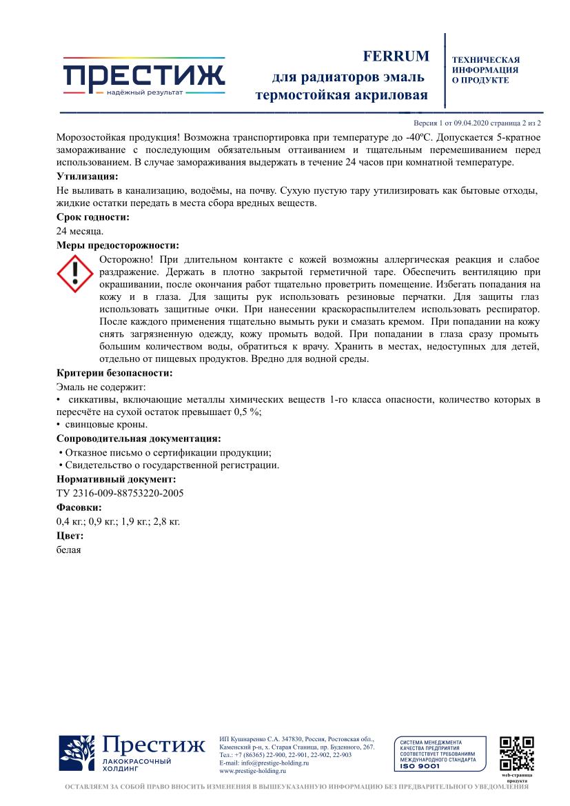 Свойства и особенности: легко наносится, быстро сохнет, экологически чистая, не имеет резкого запаха. После высыхания образует шелковистую полуглянцевую поверхность. Стойкая к мытью и истиранию. Не желтеет при воздействии температур до 100 ºС. Эмали можно придать оттенок, используя колеры, совместимые с водно-дисперсионными материалами.