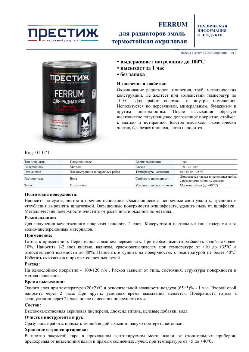 Эмаль ПРЕСТИЖ акриловая термостойкая для радиаторов белая 0,4кг