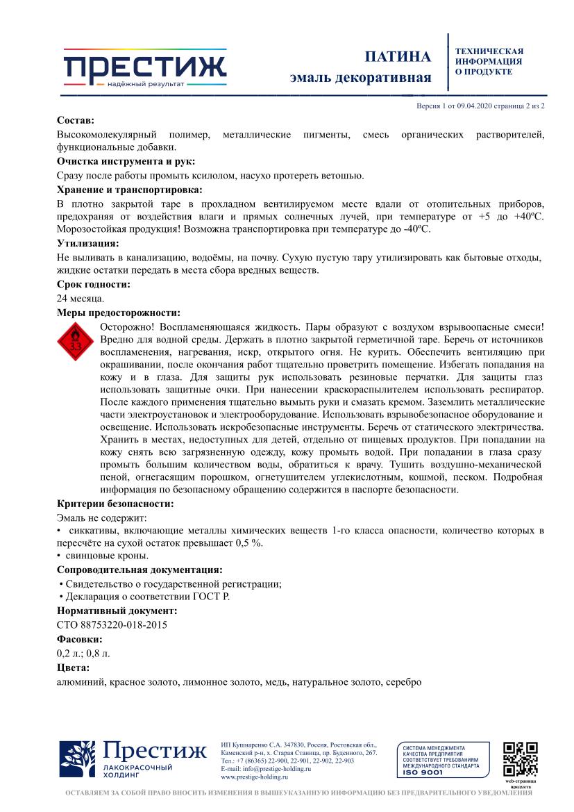 СВОЙСТВА: сохраняет защитные и декоративные свойства до 15 лет. Патина органически вписывается в текстуру основной краски, подчеркивая пластичные изгибы или острые изломы кованых узоров ненавязчивым блеском тронутой временем бронзы, меди, серебра. Изделие сразу приобретает привлекательный вид; экономичнее, чем настоящее золочение или покрытие серебром. Патиной можно выделить поры, придать состаренный античный вид изделию, подчеркнуть контуры. Может применяться как самостоятельное покрытие по предварительно загрунтованным поверхностям.