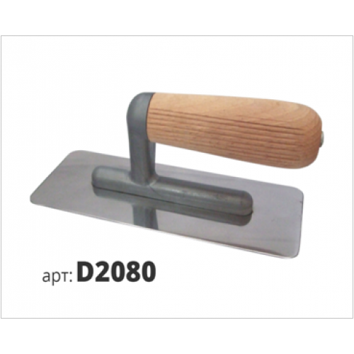 размер 200х80х0.6 мм, кельма из нержавеющей стали, края сточены, двусторонняя полировка, радиус скругления - 5 мм, удобная деревянная ручка
