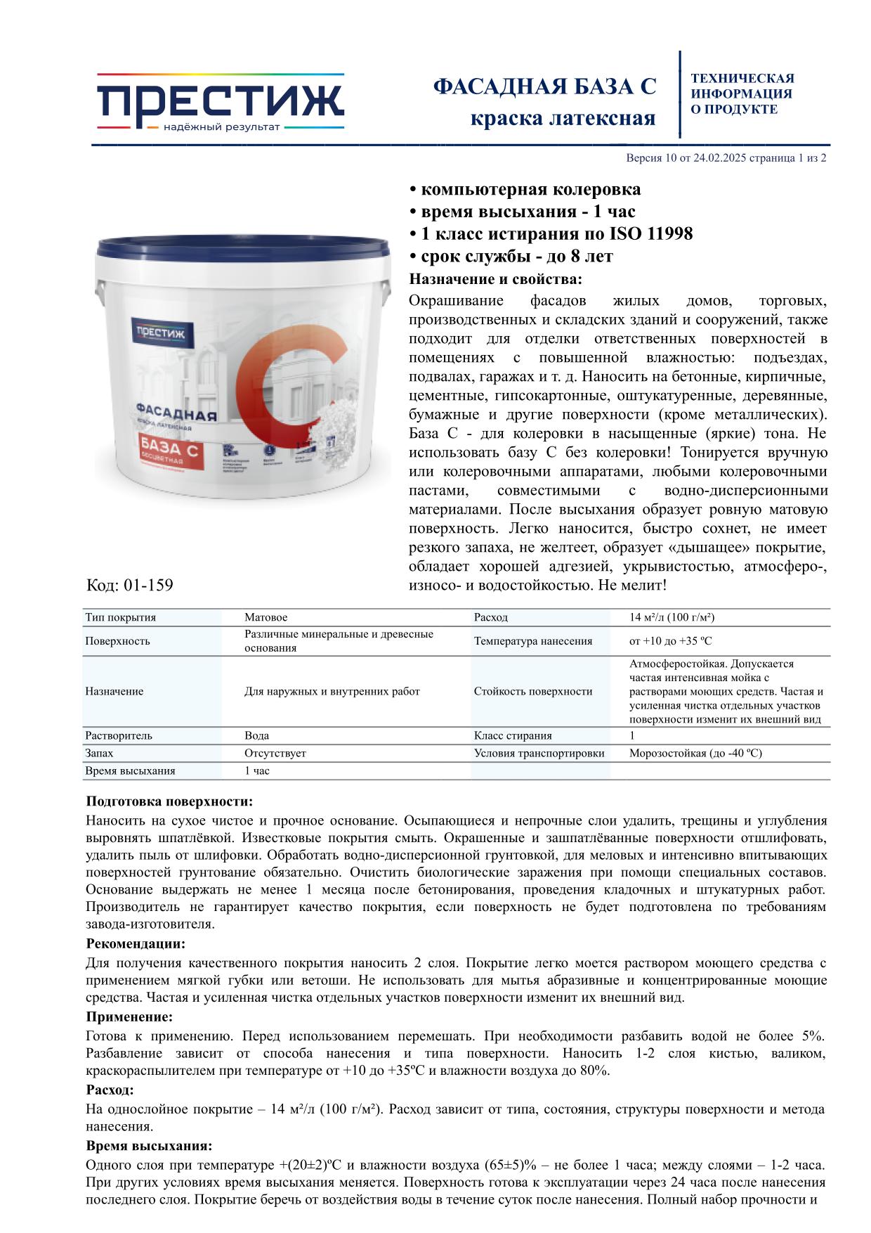 Краска Престиж ВД латексная фасадная База С 0,9 л