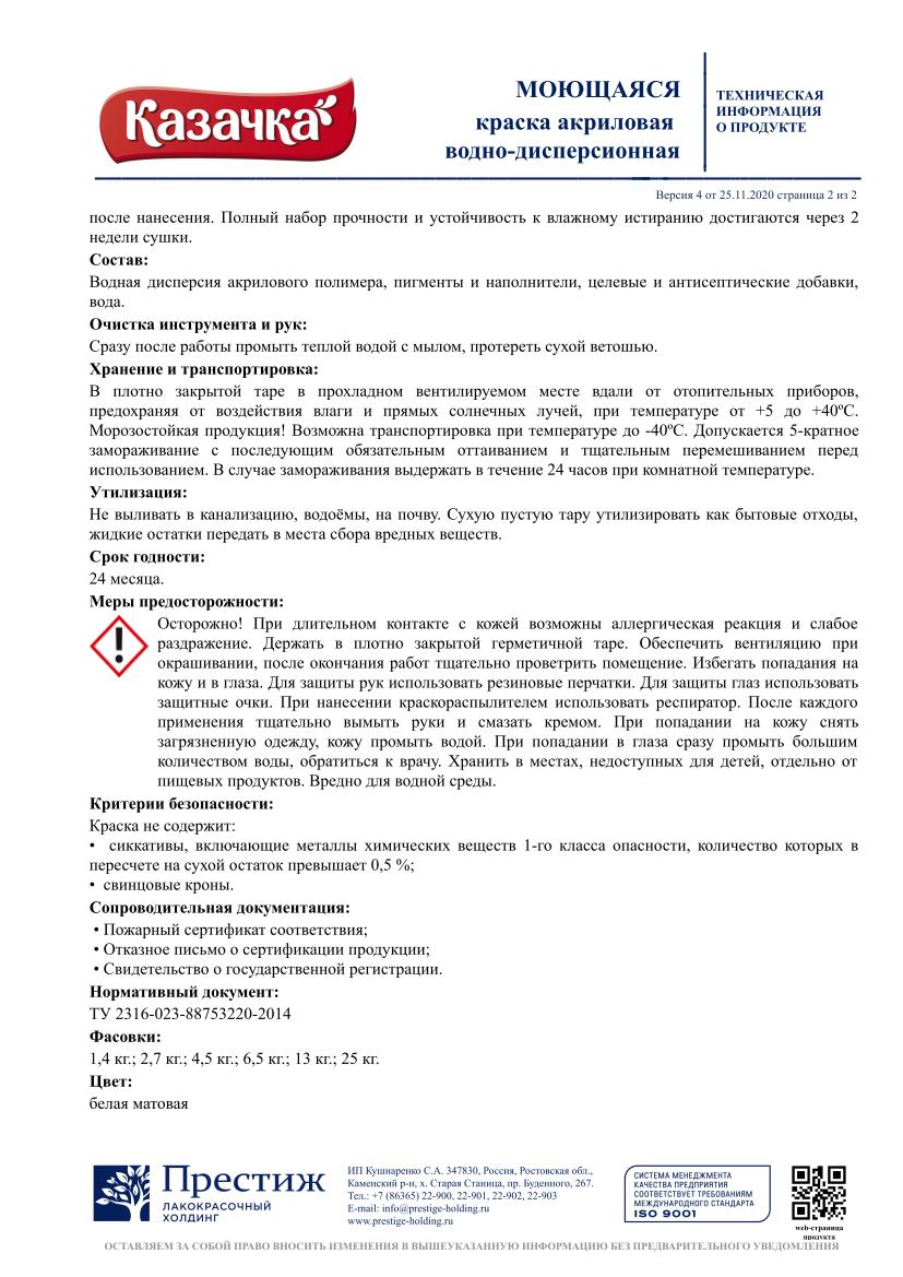 Краска КАЗАЧКА ВД-АК моющаяся (W4)4,5кг