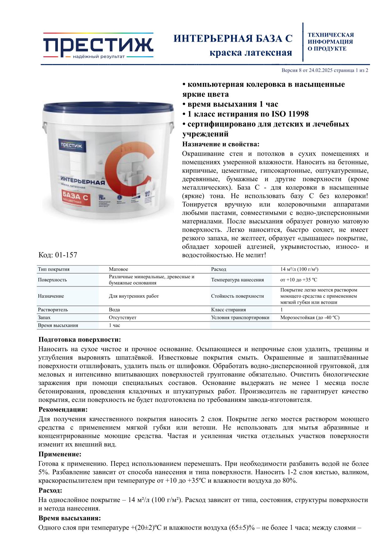 Краска Престиж ВД латексная интерьерная База С 9 л