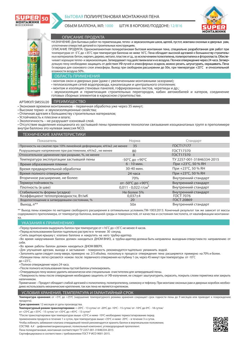 Однокомпонентная полиуретановая бытовая монтажная пена с максимальной производительностью и увеличенным выходом, а также с оптимальным количеством закрытых пор, имеющая адгезию к большинству строительных материалов: бетон, кирпич, дерево, металл и т.д., за исключением полиэтилена, полипропилена и фторопласта. Обеспечивает хорошую тепло- и звукоизоляцию. Затвердевает под воздействием влаги из воздуха. Полное отверждение через 24 часа. Затвердевшую пену можно резать, штукатурить, окрашивать. Пена безвредна для озонового слоя атмосферы. Выход при свободном расширении до 50 л.