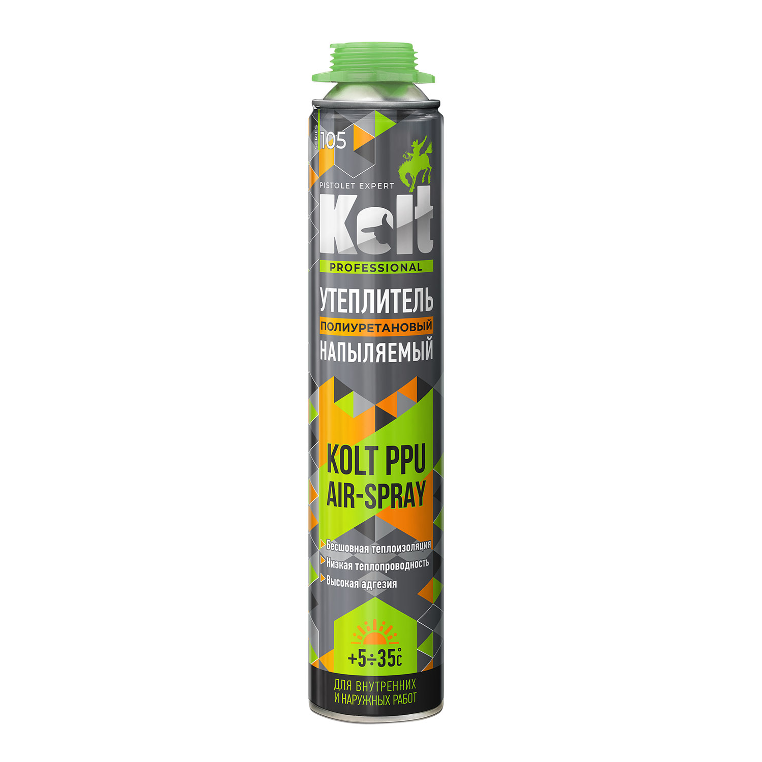 Однокомпонентная полиуретановая профессиональная композиция спрей-пены KOLT PPU AIR-SPRAY, снабженная распыляемой головкой, имеющая веерное распыление утеплителя обеспечивающее максимальное расширение и большую укрывистость поверхности и заполнение неровностей. Улучшает теплоизоляционные свойства кладки. Быстрое, удобное нанесение без использования большого объема воды, электричества. Не требует дополнительного монтажа каркасов и использования прочих материалов. Затвердевает под воздействием влаги из воздуха. Полное отверждение через 2 часа в слое 4-6 см. Не имеет адгезии: к полиэтилену, полипропилену, тефлону, полиамиду, силикону.