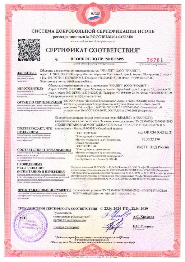 Пена монтажная REALIST PRO 70л огнестойкая
