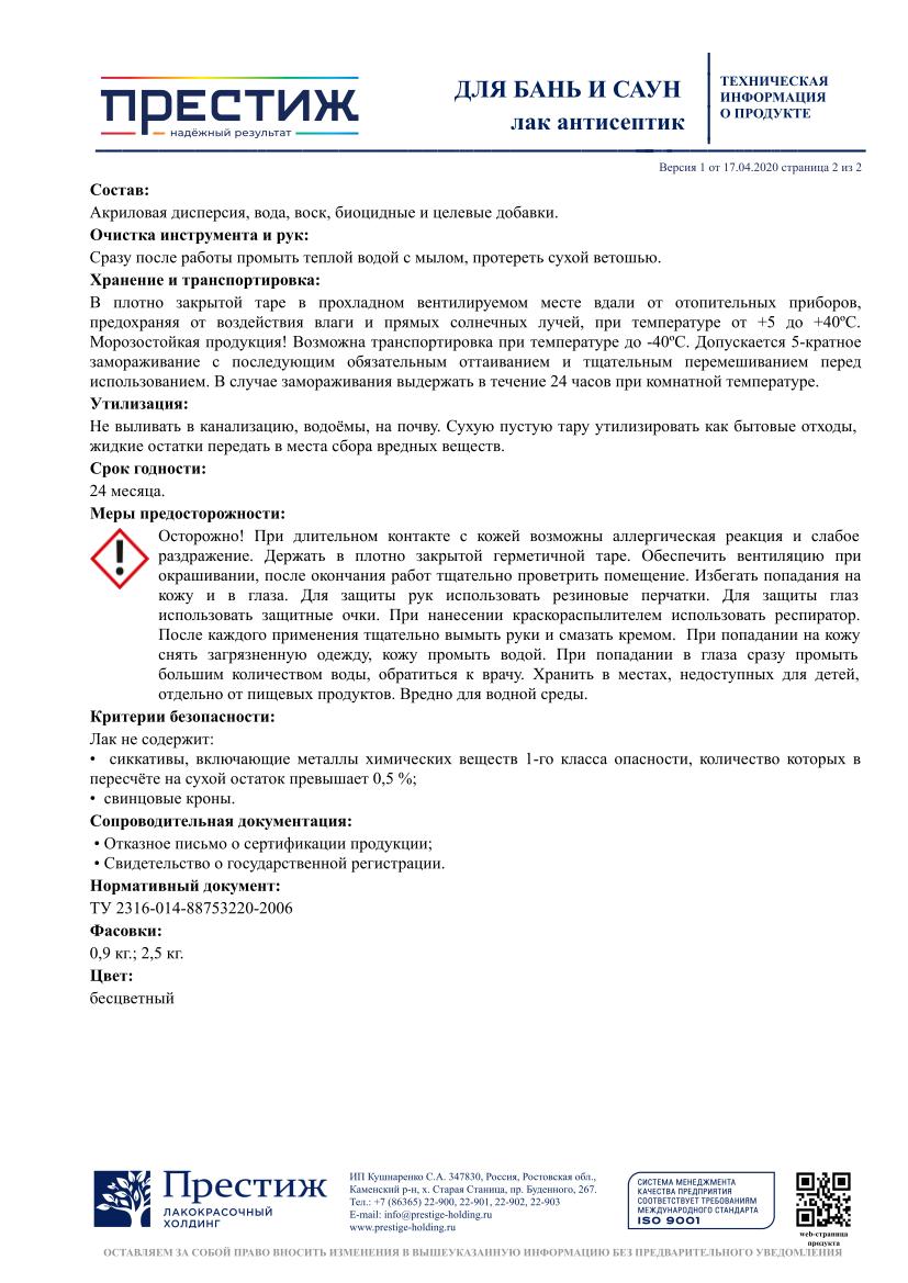 Лак ПРЕСТИЖ акриловый для бань и саун 2,5кг