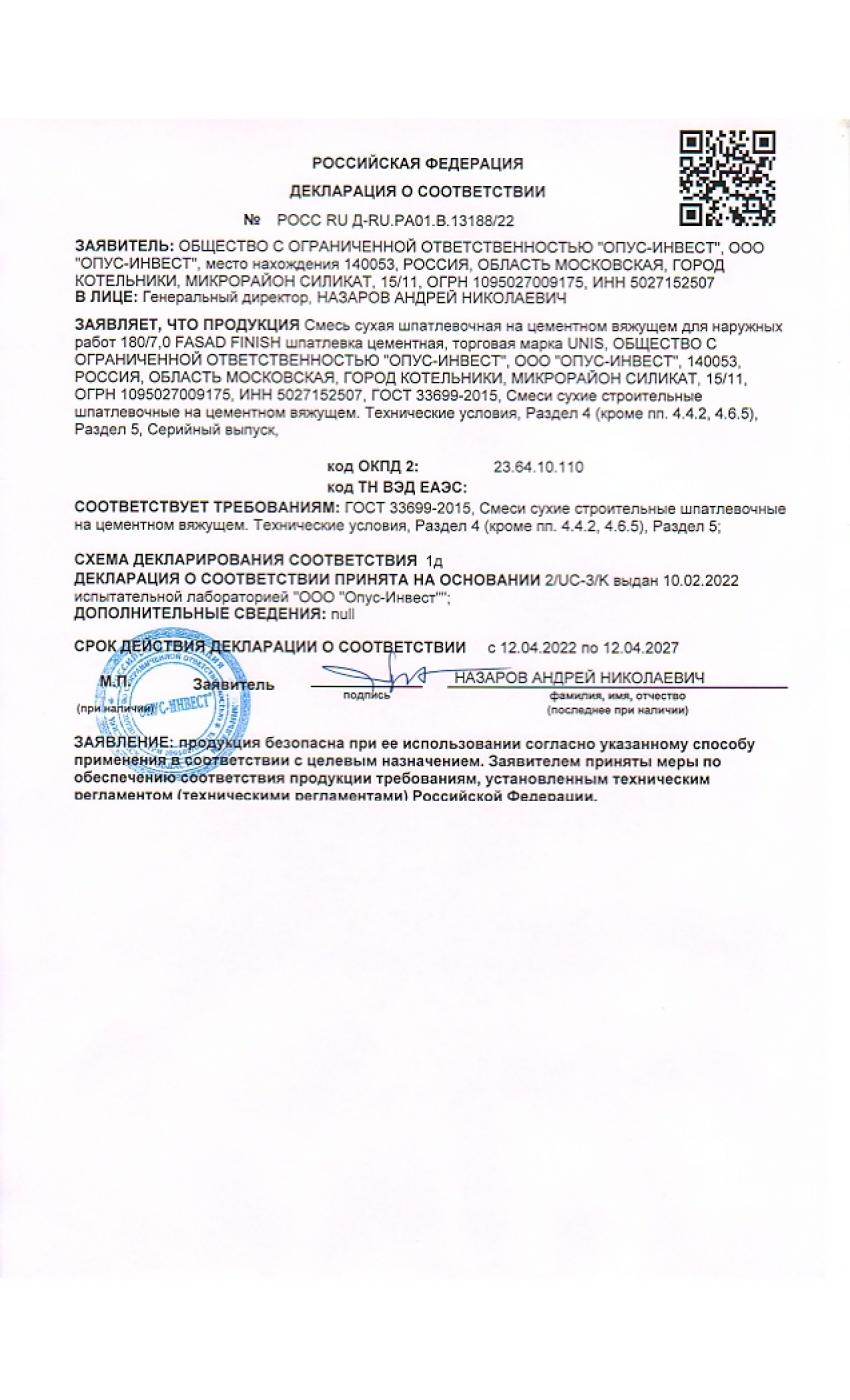 Юнис Fasad Finish Шпатлевка цементная 20кг